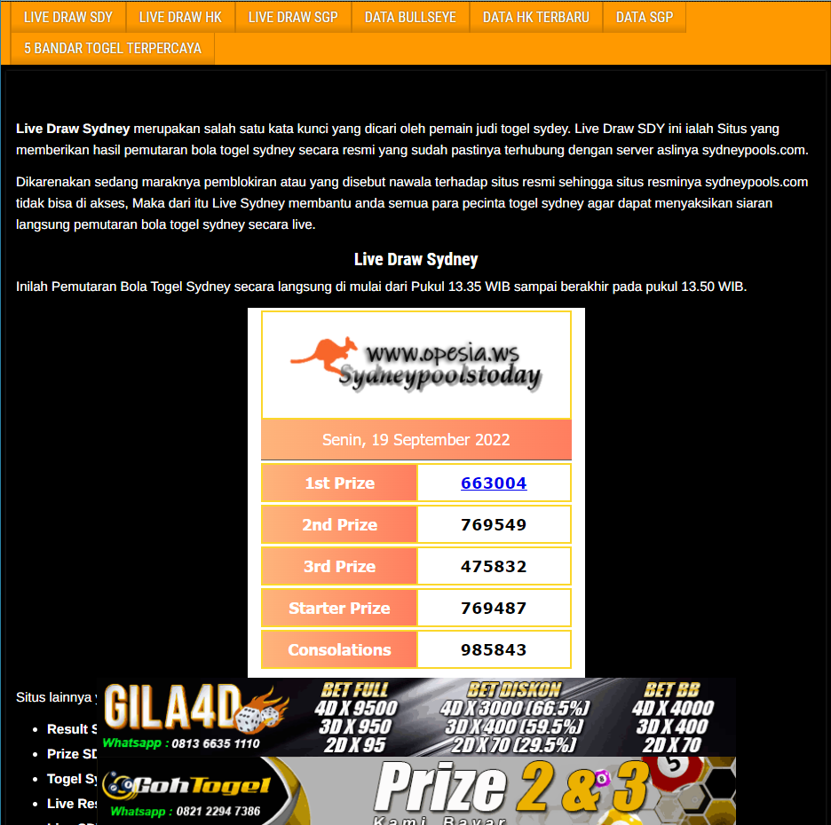 Keluaran Togel Sydney, Data hasil result togel, keluaran togel result lengkap tercepat, result nomor togel semua pasaran Keluaran Togel Sydney - Hasil Result Togel Terlengkap Tercepat HASIL TOGEL.NET Result SDY ialah sebuah hasil keluaran sdy yang di bagikan langsung oleh pihak Togel Sydney. Di mana togellers bisa mendapatkan Pengeluaran sdy setiap harinya. Seluruh hasil sdy tersaji dalam bentuk tabel data sdy hari ini. Sehingga bagi para bettor yang mengalami ketertinggalan pada saat waktu pengeluaran tersebut bisa melihat reka ulangnya.